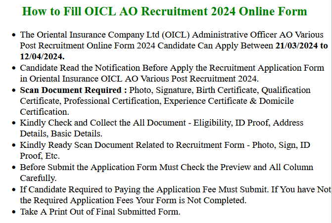 आवेदन करने के लिए candidates को Oriental Insurance Company की official website orientalinsurance.org.in पर जाना होगा और वहां पर दिए गए निर्देशों का पालन करना होगा। candidates को अपने Personal and educational details को सही और पूरी तरह से भरकर आवेदन करना होगा।